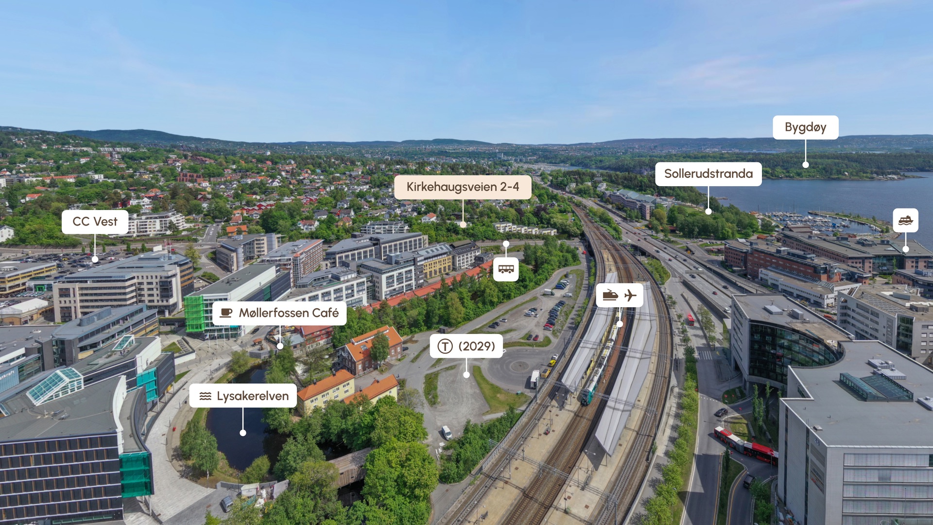 Boligene blir liggende 150 meter fra Lysaker togstasjonen. Med den nye T-banen fra Lysaker er man på Majorstuen på ti minutter. CC Vest ligger rett over veien, og det er bare et par hundre meters rusletur ned langs Lysakerelva til Sollerudstranda, Lysaker Brygge og båthavnen.